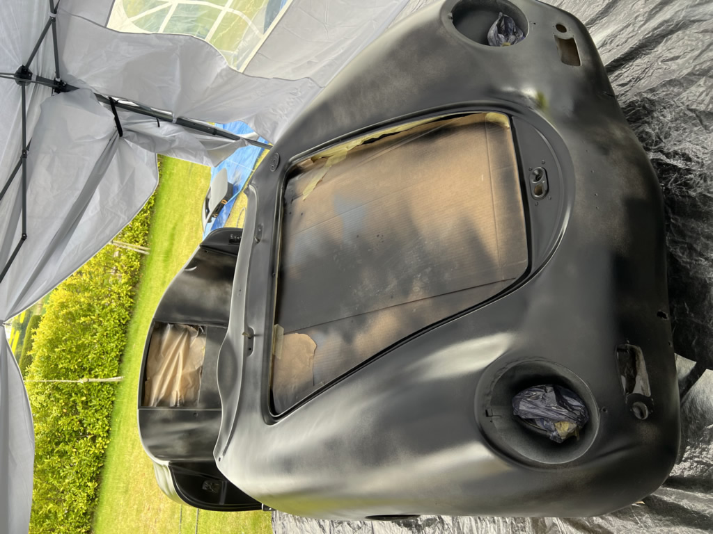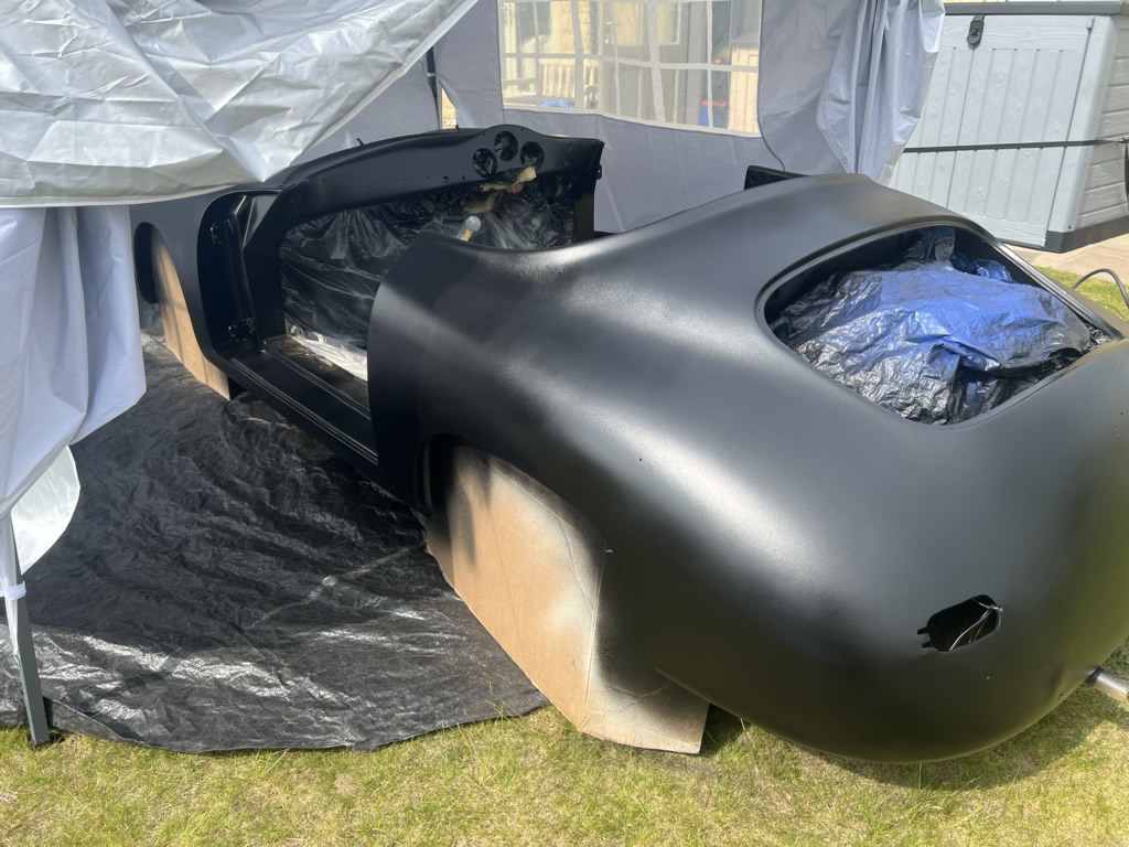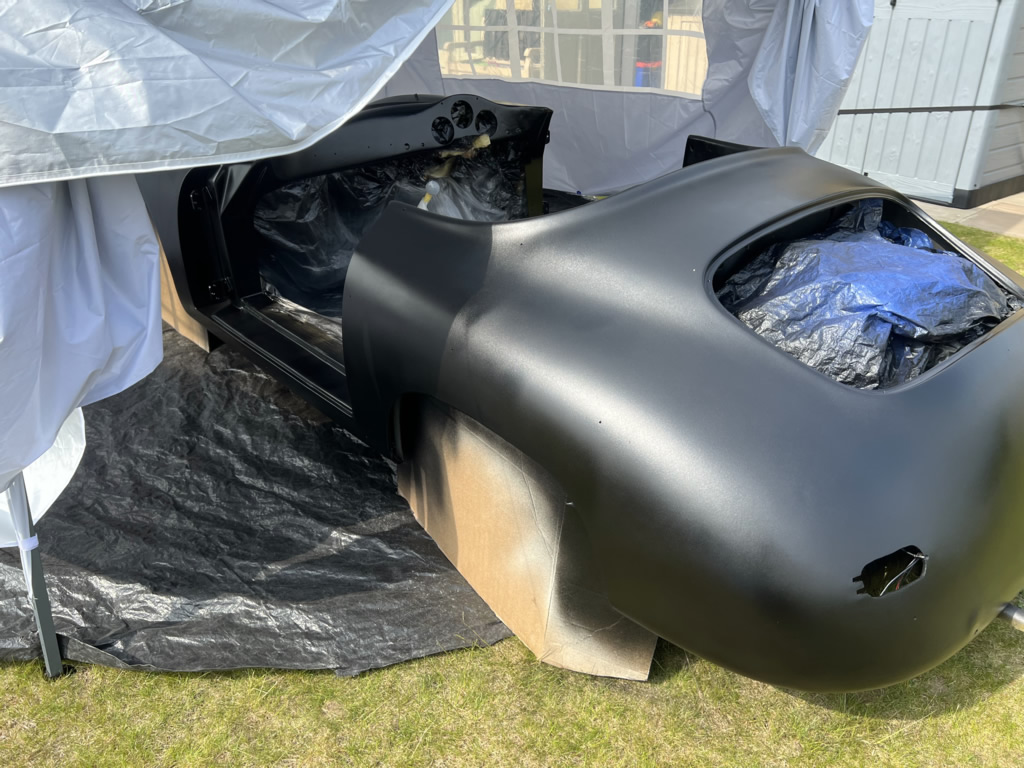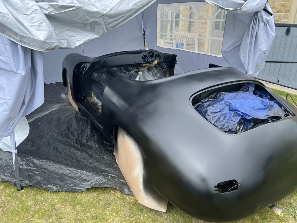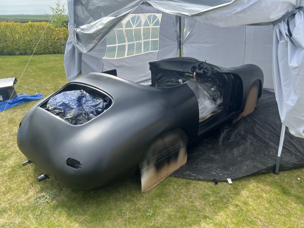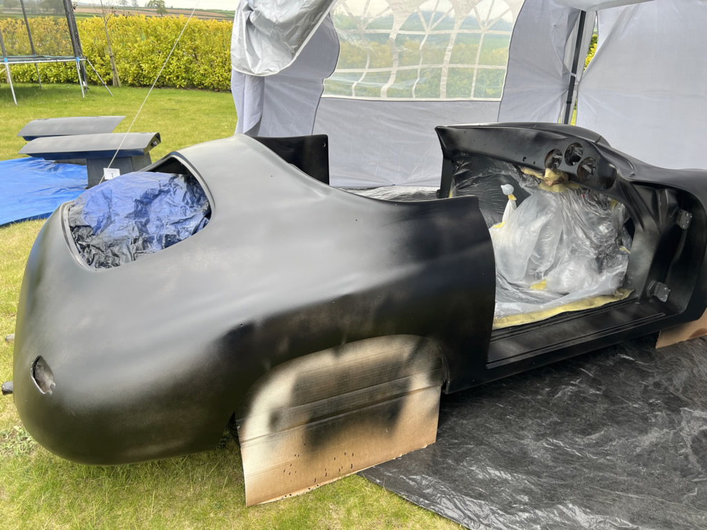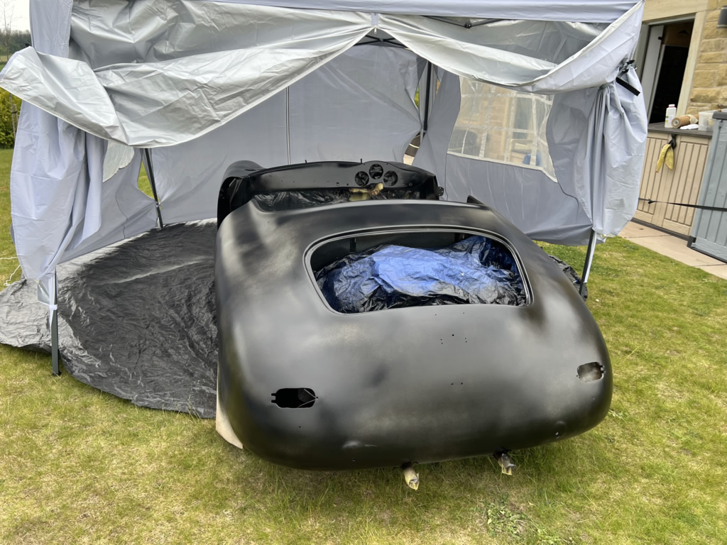 Apr 25 - (Part 1) Car stripped down and taken into the garden to be sprayed in epoxy primer first, then jet black paint basecoat