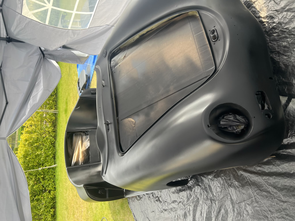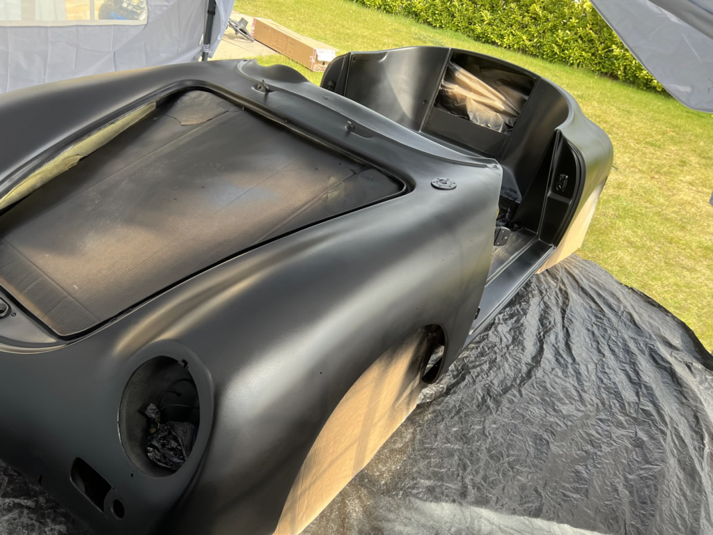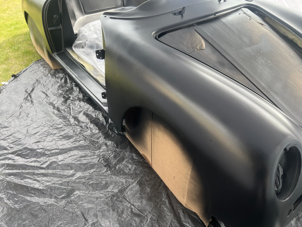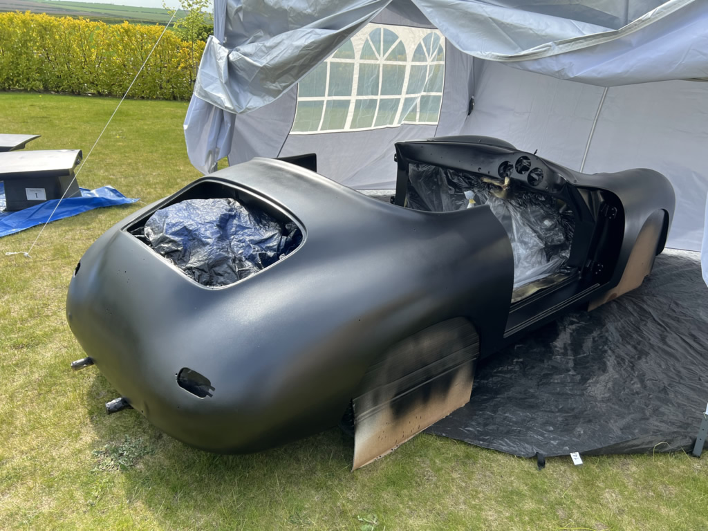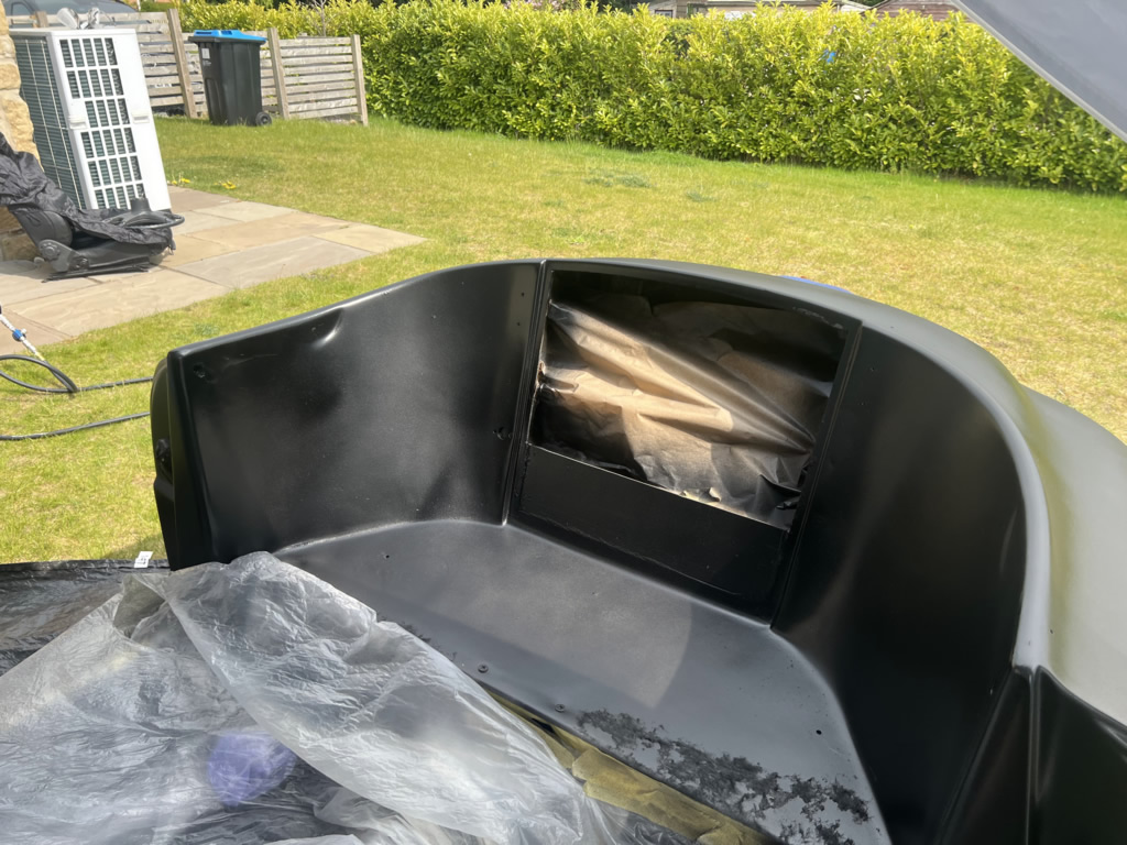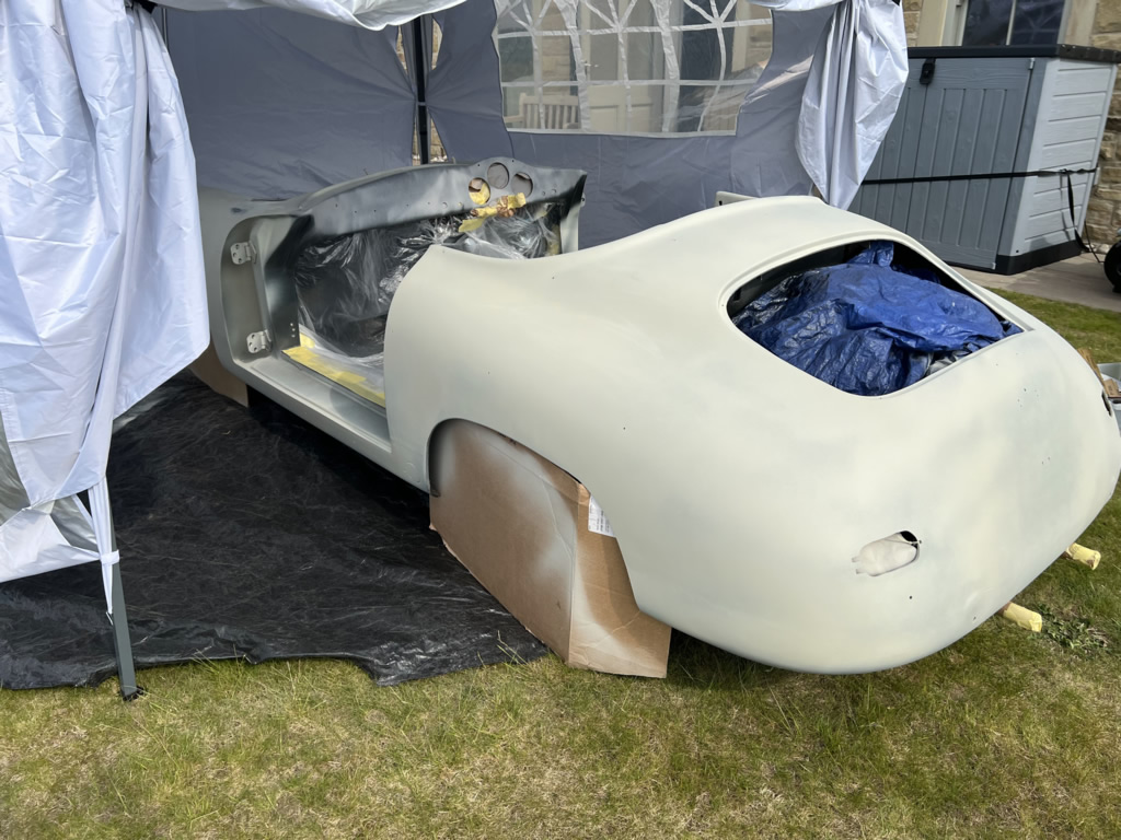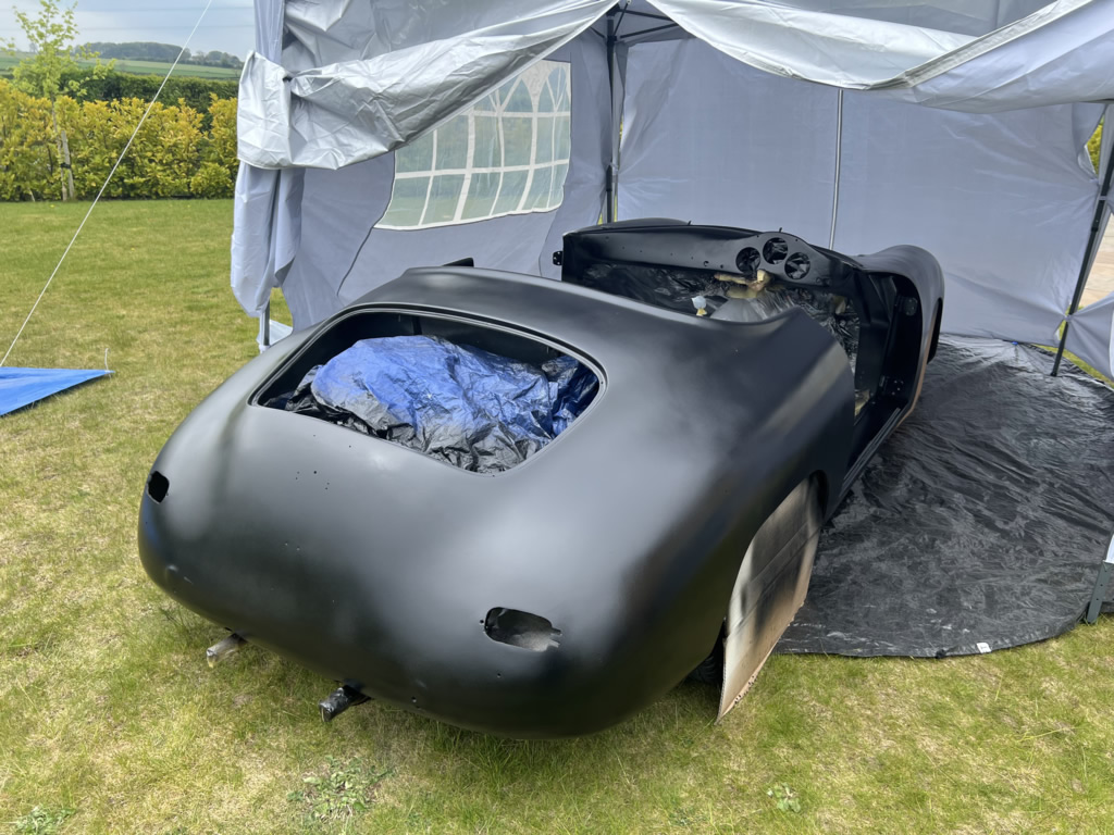 Apr 25 - (Part 1) Car stripped down and taken into the garden to be sprayed in epoxy primer first, then jet black paint basecoat