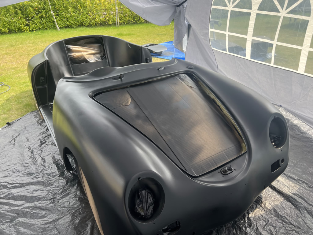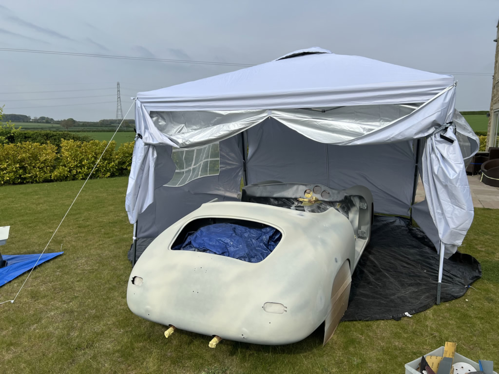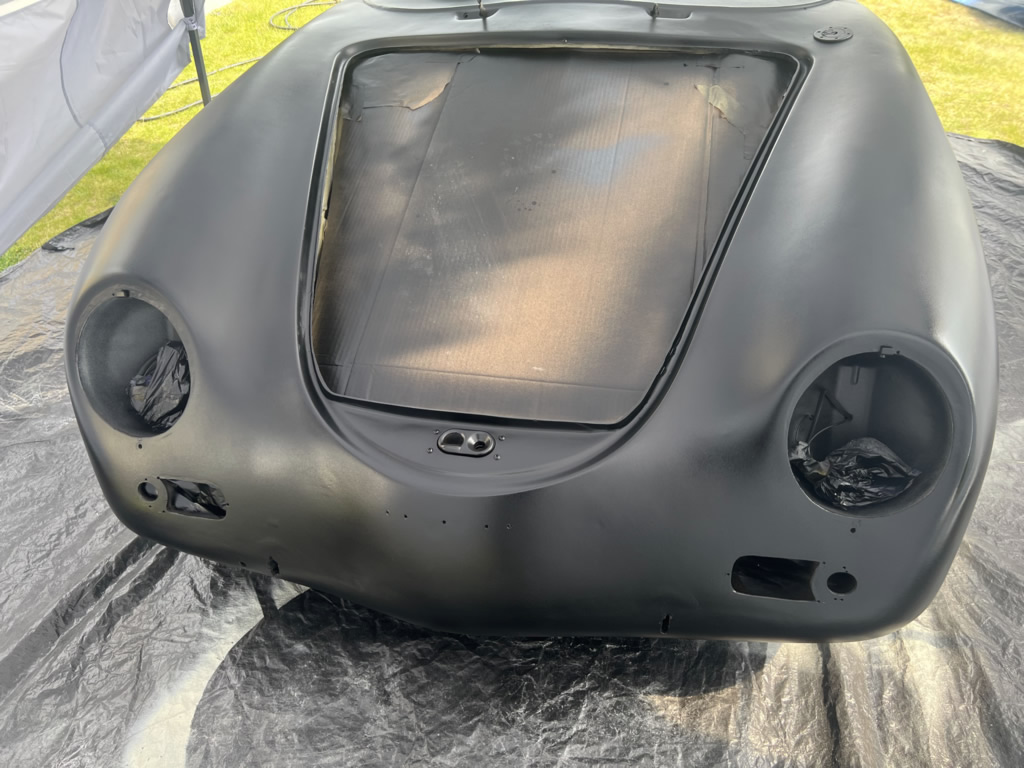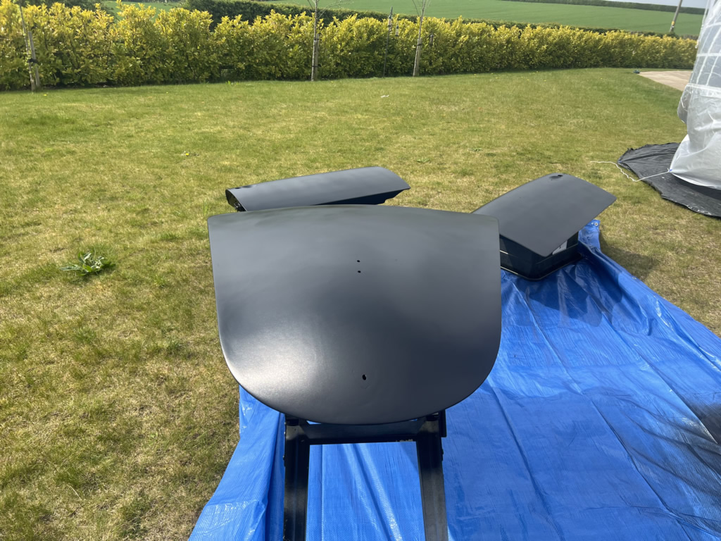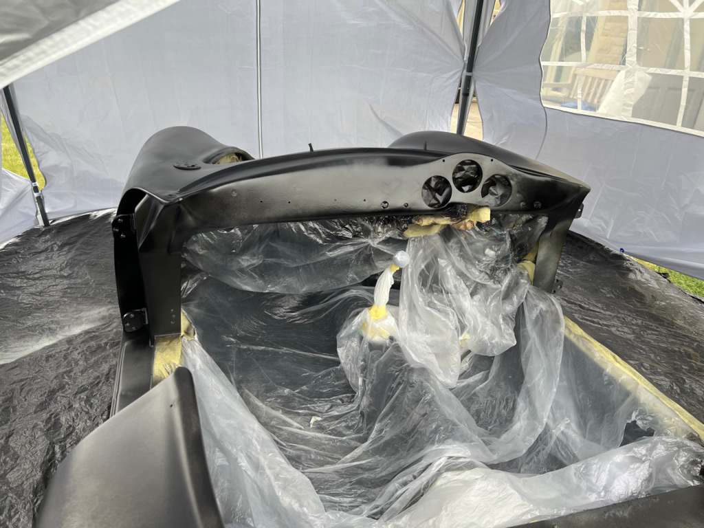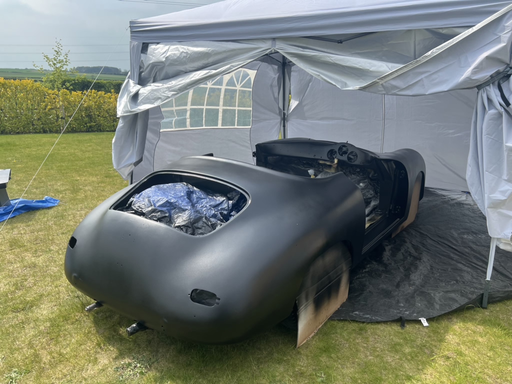 Apr 25 - (Part 1) Car stripped down and taken into the garden to be sprayed in epoxy primer first, then jet black paint basecoat