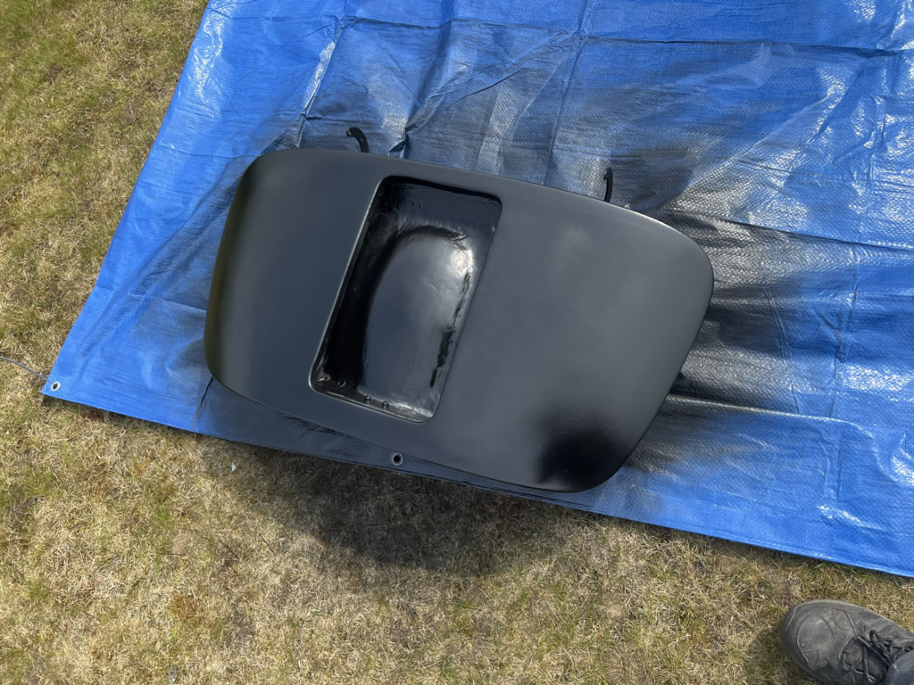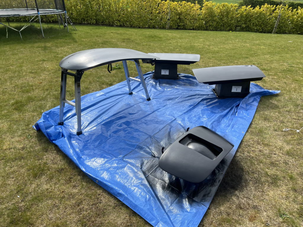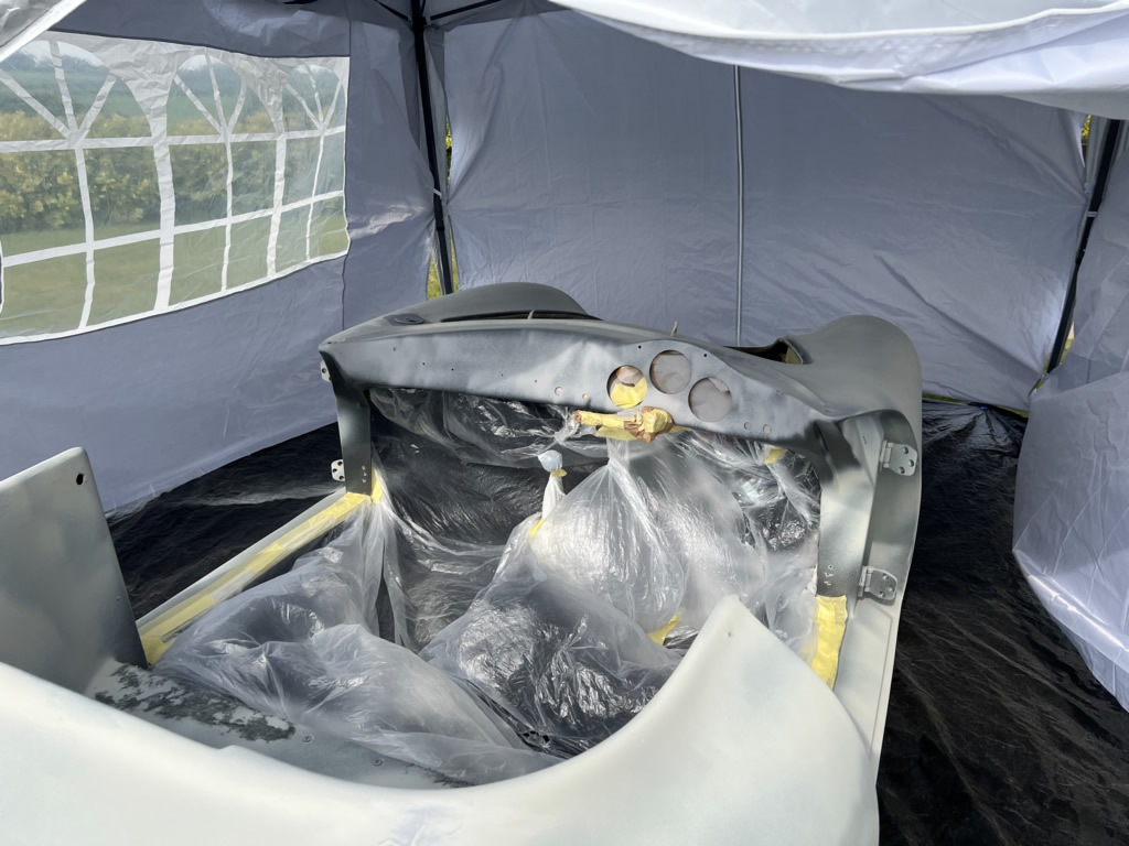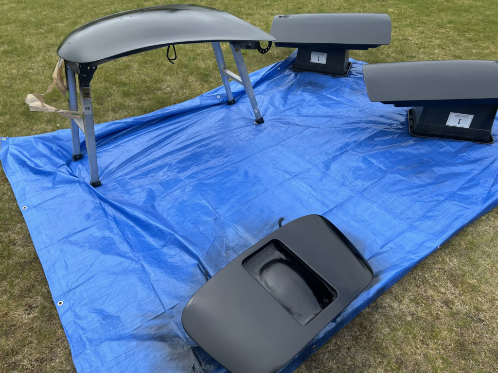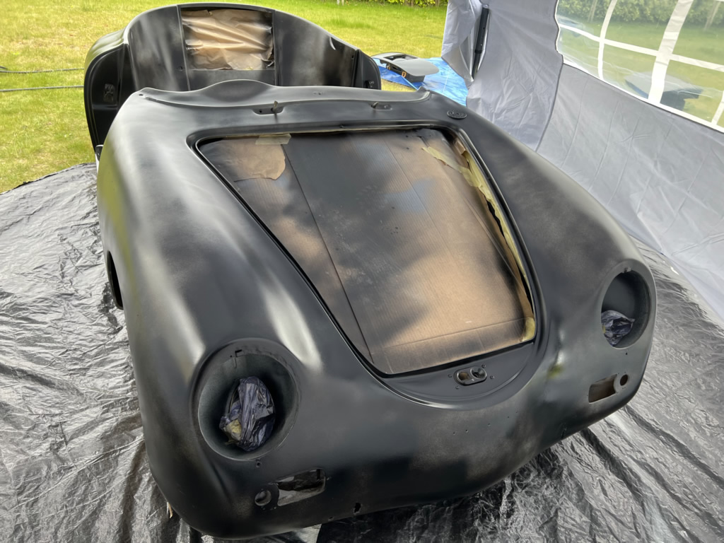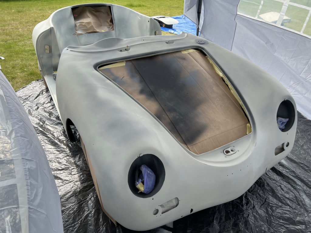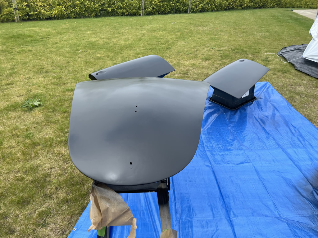 Apr 25 - (Part 1) Car stripped down and taken into the garden to be sprayed in epoxy primer first, then jet black paint basecoat