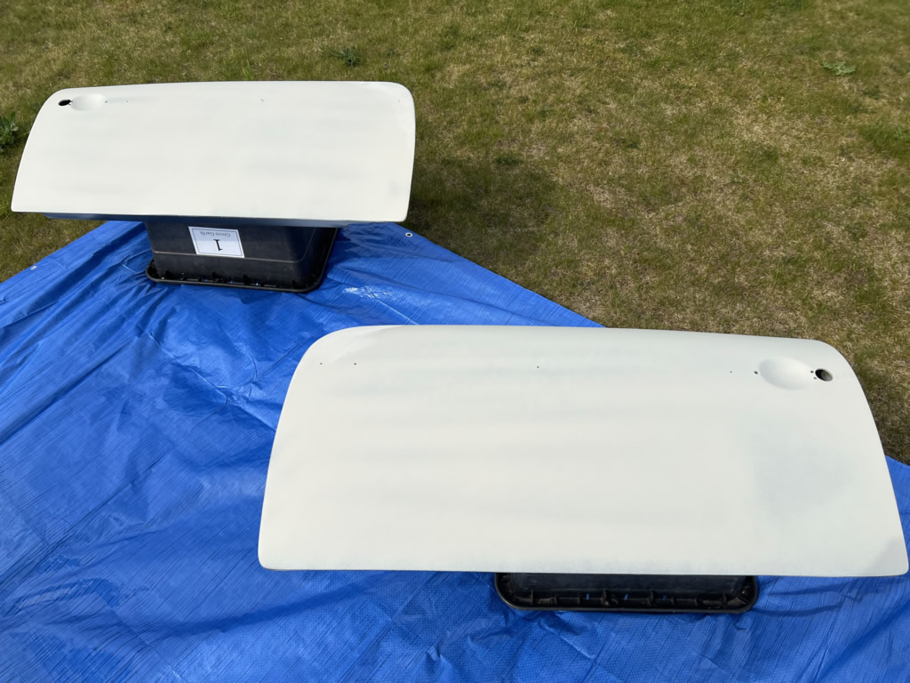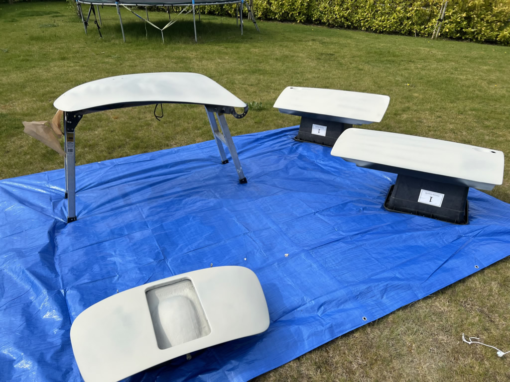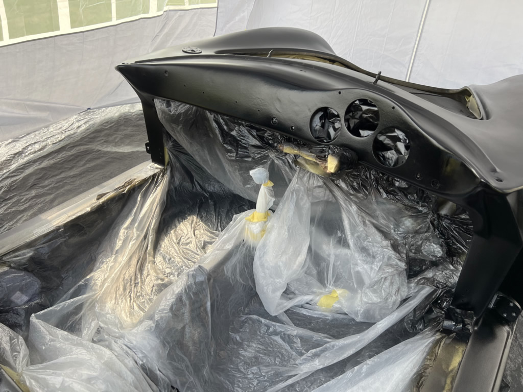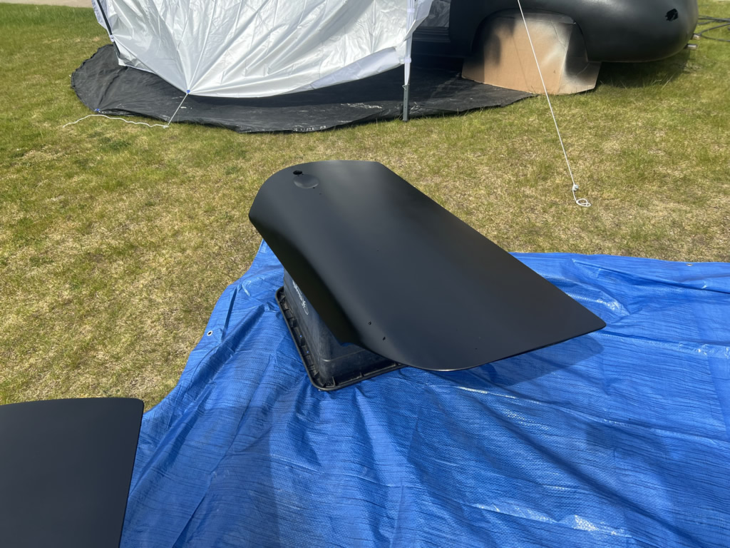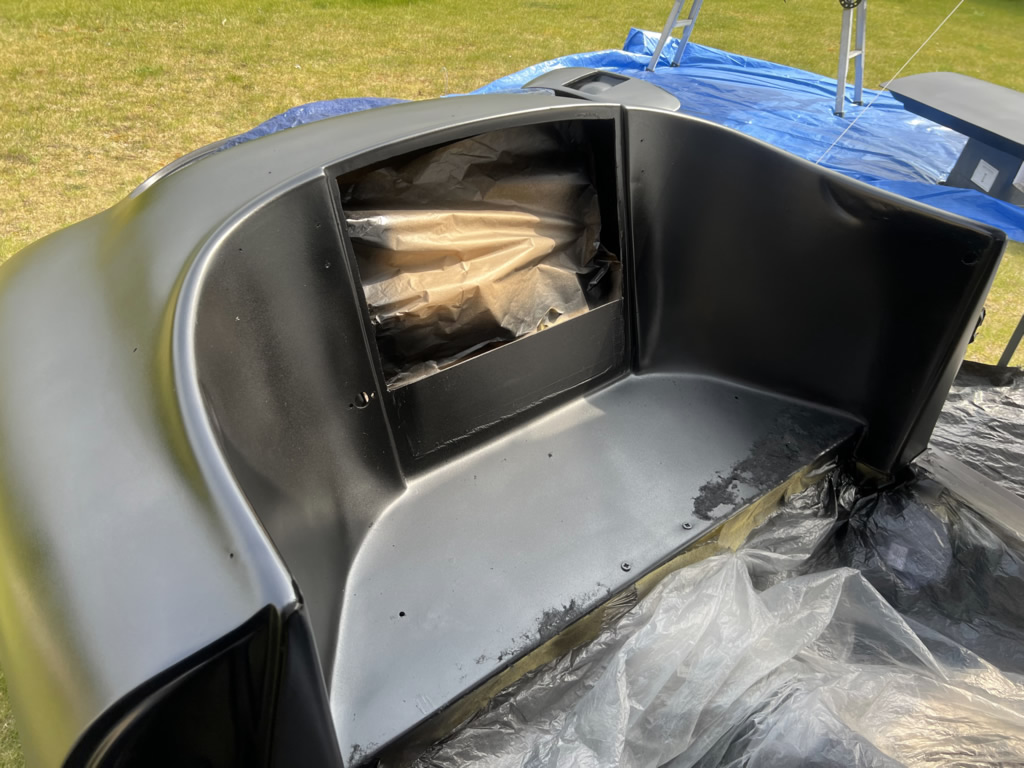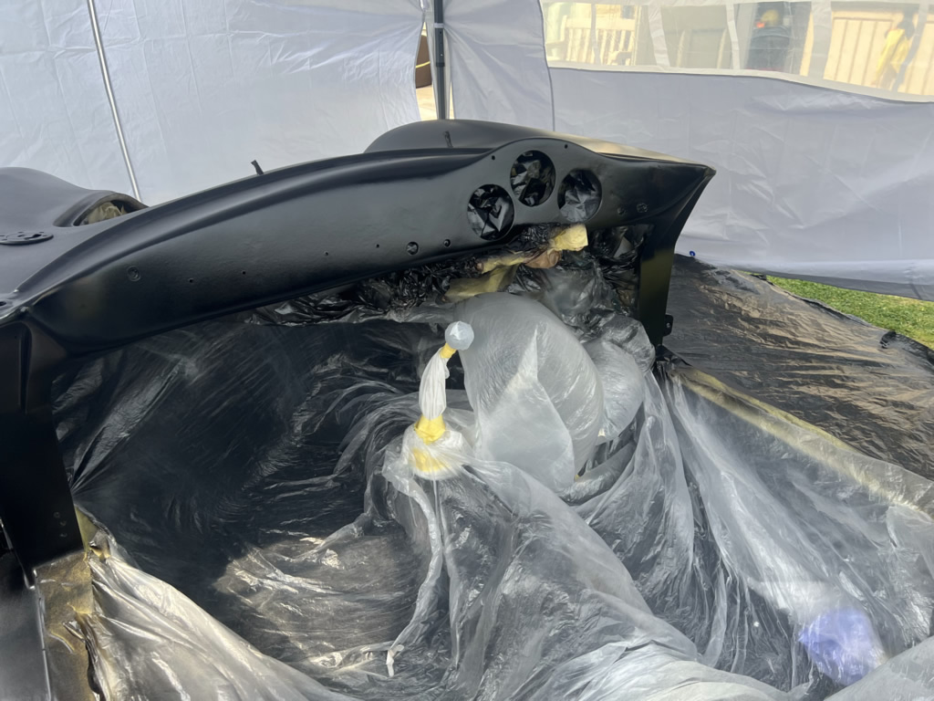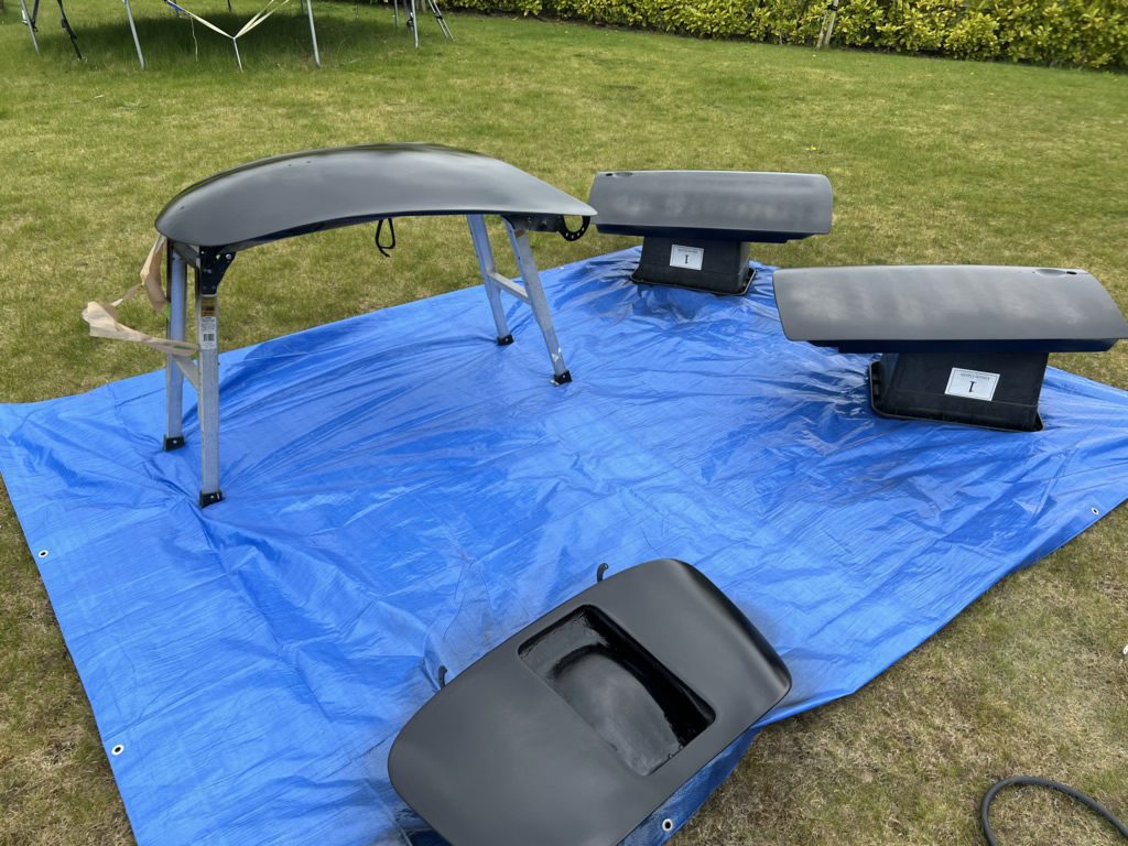 Apr 25 - (Part 1) Car stripped down and taken into the garden to be sprayed in epoxy primer first, then jet black paint basecoat